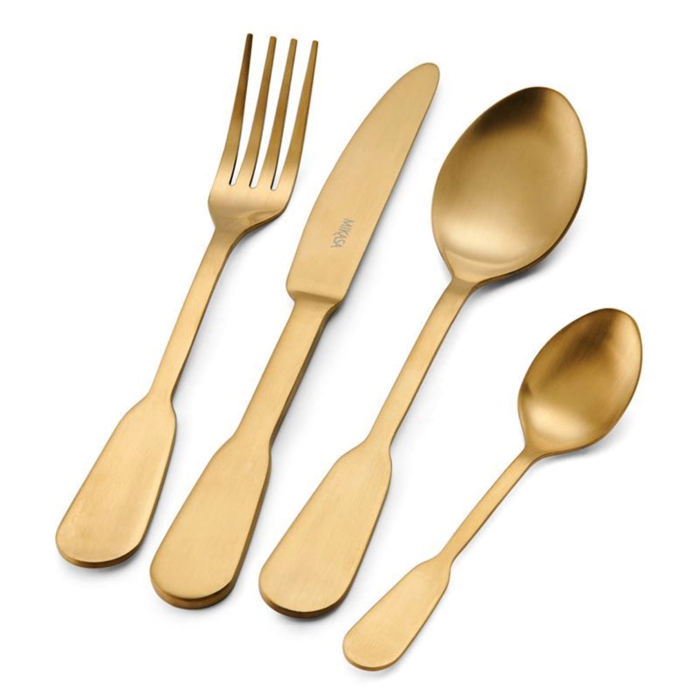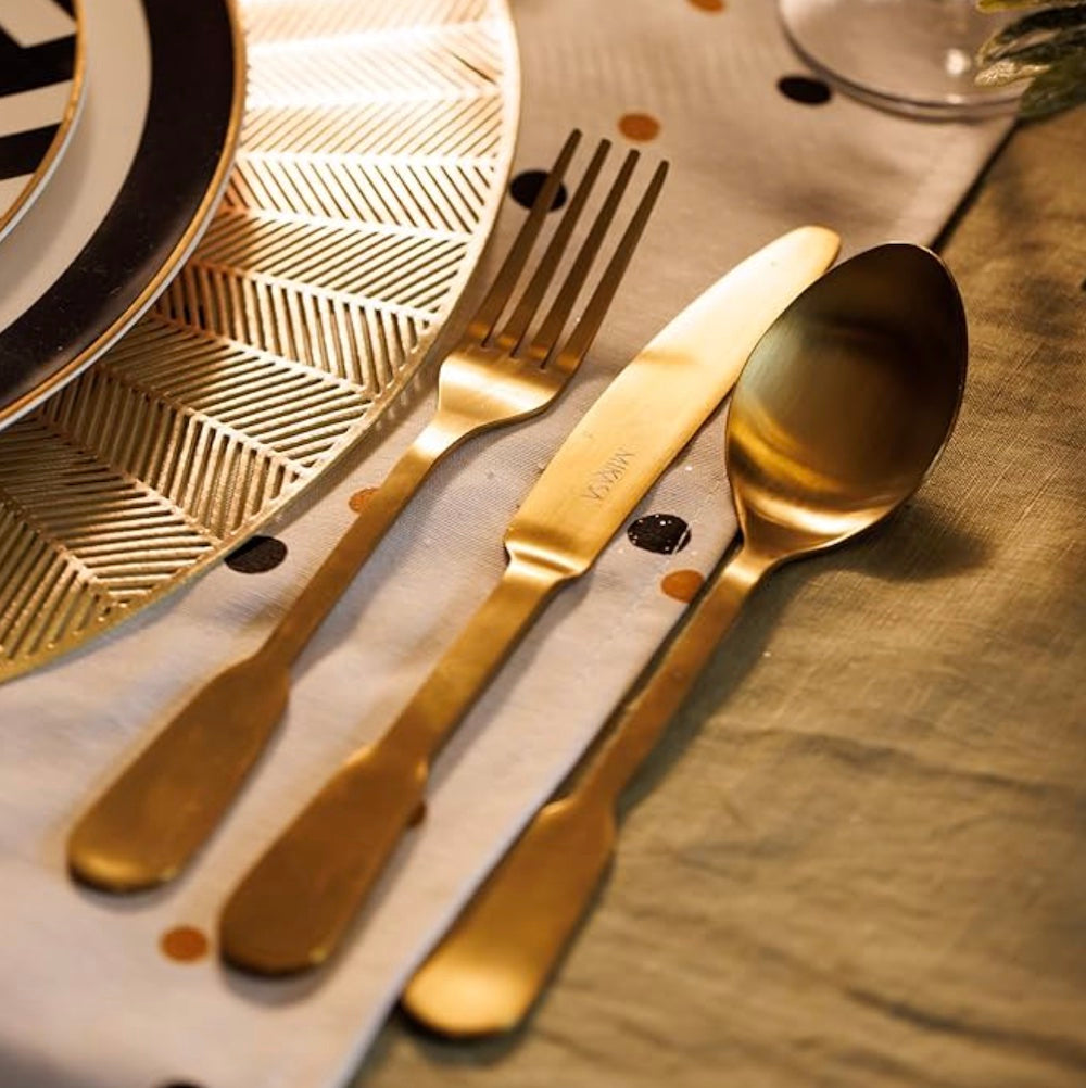 The Solo Gold 16pc Cutlery Set features a straightforward design that enhances everyday meals while highlighting expert craftsmanship. Perfect for four, this set includes knives, forks, dessert spoons, and teaspoons, all crafted from sturdy 18/0 stainless steel with rounded paddle ends for comfort and a brass finish for durability. Rust-resistant and dishwasher-safe, it’s built for regular use and backed by a 20-year warranty, offering you confidence in a high-quality, reliable cutlery collection. This set complements both casual and formal dining with its blend of premium materials and modern style.