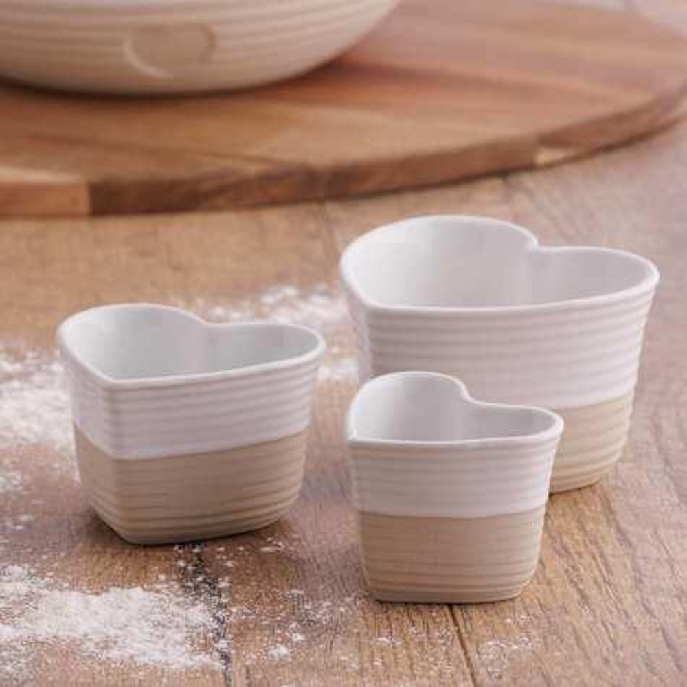 Add flair and precision to your baking with this delightful set of three measuring cups from Mason Cash. The Rustic Charm line seamlessly combines timeless aesthetics with everyday functionality, making measuring ingredients an enjoyable task. These stoneware cups in a charming cream and taupe hue will not only beautify your kitchen counter, but also aid in creating scrumptious cakes, cookies, and more.