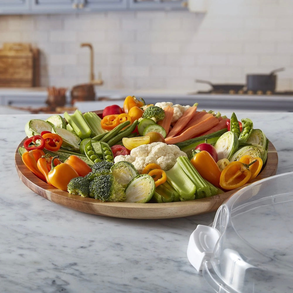 Elevate your snack experience with this sturdy, clear-covered bamboo board featuring five convenient compartments. The central section is perfect for dips and sauces, enhancing your meal prep, serving, and snacking effortlessly. Ideal for brunches, picnics, or simply keeping your kitchen organized, this platter combines freshness with style. Its elegant design includes a card slot for easy labeling, and the natural bamboo finish suits any setting—inside or outdoors. Make every snack moment more enjoyable and beautifully presented.